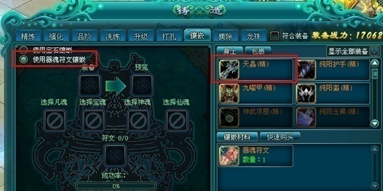 活动期间,强化+20的精装备可在强化界面,选择使用龙神附体强化界面,进行龙魂附体,附体成功后,可在铸造界面的龙珠界面进行镶嵌龙珠,镶嵌满7颗龙珠后可在强化界面激活龙魂,直接将强化+20提升至强化+30.