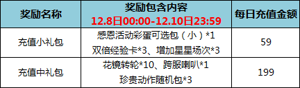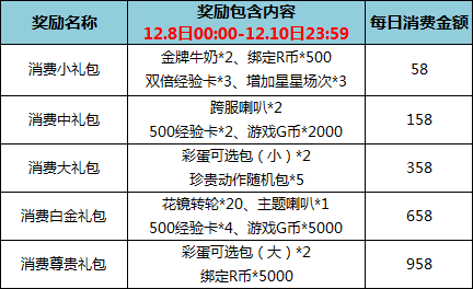 1. 活动期间,在12月8日00:00-12月10日23:59,玩家每日充值达到一定金额,即可免费领取所对应的奖励礼包,每个奖励可每天只能领取一次,消费金额按天计算,次日将重新计算消费金额;
