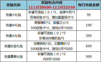 1. 活动期间,在12月13日00:00-12月15日23:59,玩家每日充值一定金额,即可免费领取所对应的充值奖励礼包,每个奖励每日只能领取一次,充值金额累计计算;