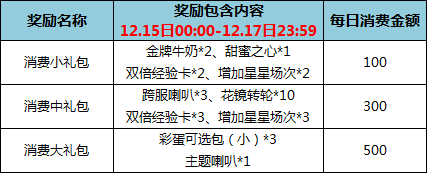 1. 活动期间,在12月15日00:00-12月17日23:59,玩家每日消费达到一定金额,即可免费领取所对应的奖励礼包,每个奖励可每天只能领取一次,消费金额按天计算,次日将重新计算充值金额;