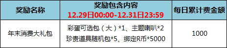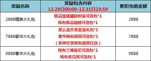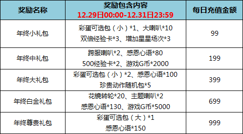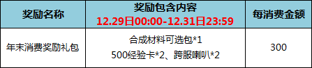 3. 同时,在12月29日00:00-12月31日23:59,玩家每消费300元,即可免费年末消费奖励礼包,该奖励可多消费多领,消费金额累计计算;