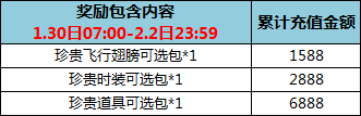 2. 同时,在1月30日07:00-2月2日23:59,玩家累计充值达到一定金额,还可免费领取诸多珍贵道具,每个奖励只能领取一次,充值金额累计计算;