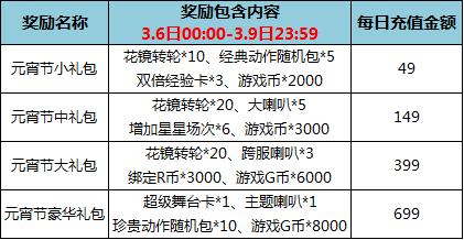 1.活动期间,在3月6日00:00-3月9日23:59,玩家每日充值一定金额,即可免费领取所对应的充值奖励礼包,奖励每日只能领取一次,充值金额按天计算;