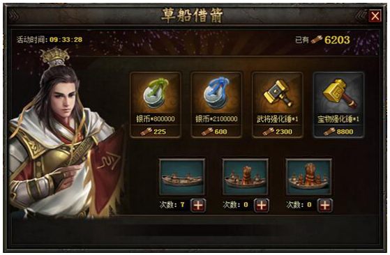 活动内容:活动期间,玩家可通过招募船队出航收集箭矢。筹集的箭矢不仅可用来兑换银币,更可兑换武将强化锤及宝物强化锤!快去收集箭矢吧!