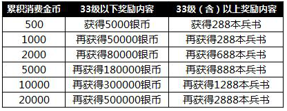注:消费所赠送的银币或兵书,可累积领取(例:32级玩家累计消费满5000金币,共可获得360000银币)