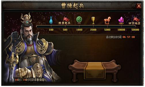 活动内容:活动期间,通过充值资助曹操可获得曹操回赠的赠礼!同时玩家在10点或19点可获领取免费曹操赠礼,宝箱内可开出10金币。