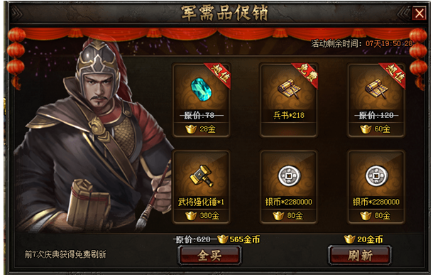 3、每次刷新出来的物品如果选择全部购买还将获得折上折,福利拿不停,住各位将军国庆愉快!