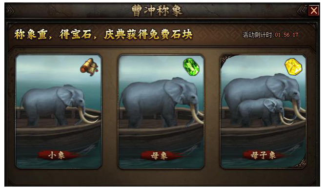 曹冲称象喜获丰厚大奖,活动期间,大家通过给大象称重可获得宝石或宝石卷轴奖励,同时称重最精确的玩家还可获得更多额外奖励!