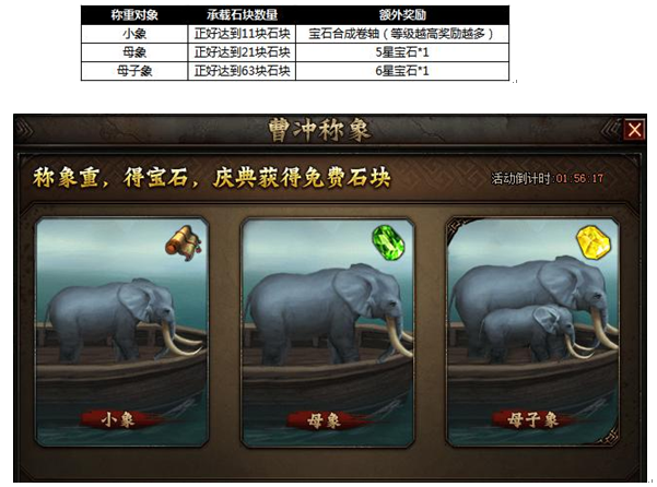 活动内容:活动期间,玩家通过给小象、母象或母子象称重来获得宝石或宝石合成卷轴奖励,且增加石块达到指定数量还可获得曹操赐予的额外奖励。
