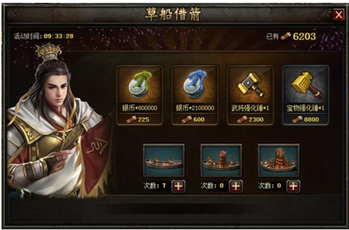 活动内容:活动期间,玩家可通过招募船队出航收集箭矢。筹集的箭矢不仅可用来兑换银币,更可兑换武将强化锤及宝物强化锤!快去收集箭矢吧!