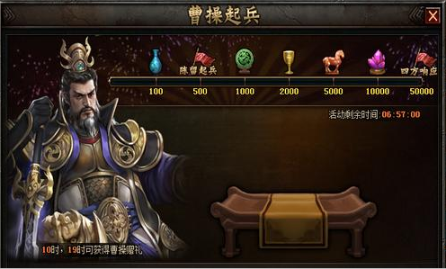 活动内容:活动期间,通过充值资助曹操可获得曹操回赠的赠礼!同时玩家在10点或19点可获领取免费曹操赠礼,宝箱内可开出10金币。