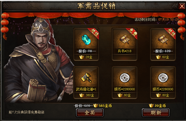 3、每次刷新出来的物品如果选择全部购买还将获得折上折,福利拿不停,住各位将军国庆愉快!