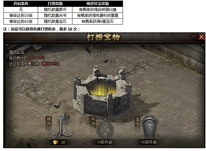 活动内容:活动期间,玩家可使用不同打捞工具在井中打捞宝物。每次打捞必定获得银币、兵书或宝石奖励,同时也有概率获得稀世珍宝!(6月21日之后打捞宝物银币类奖励大幅提升,不可错过哦~)