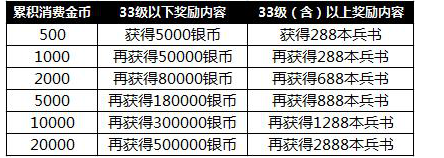 注:消费所赠送的银币或兵书,可累积领取(例:32级玩家累计消费满5000金币,共可获得360000银币)