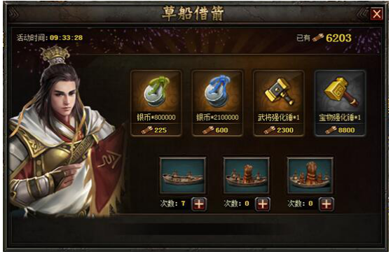 活动内容:活动期间,玩家可通过招募船队出航收集箭矢。筹集的箭矢不仅可用来兑换银币,更可兑换武将强化锤及宝物强化锤!快去收集箭矢吧!