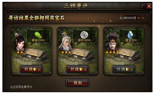 1) 每次寻访后会出现3个不同星级的人物,花费金币可升级星级,点击“领取”后将收获奖励。