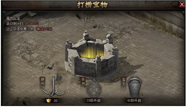 活动内容:活动期间,玩家可使用不同打捞工具在井中打捞宝物。每次打捞必定获得银币、兵书或宝石奖励,同时也有概率获得稀世珍宝!(6月21日之后打捞宝物银币类奖励大幅提升,不可错过哦~)