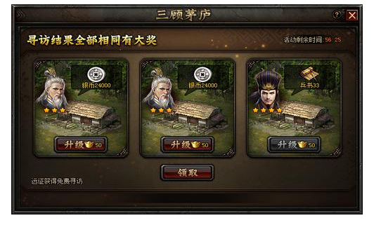 活动内容:活动期间,玩家通过寻访可获取银币、粮食、兵书等奖励,每次远征后可获得免费寻访次数(最多7次),更可花费金币进行寻访。
