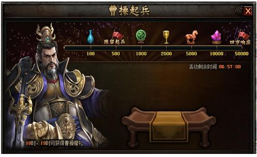 活动内容:活动期间,通过充值资助曹操可获得曹操回赠的赠礼!同时玩家在10点或19点可获领取免费曹操赠礼,宝箱内可开出10金币。