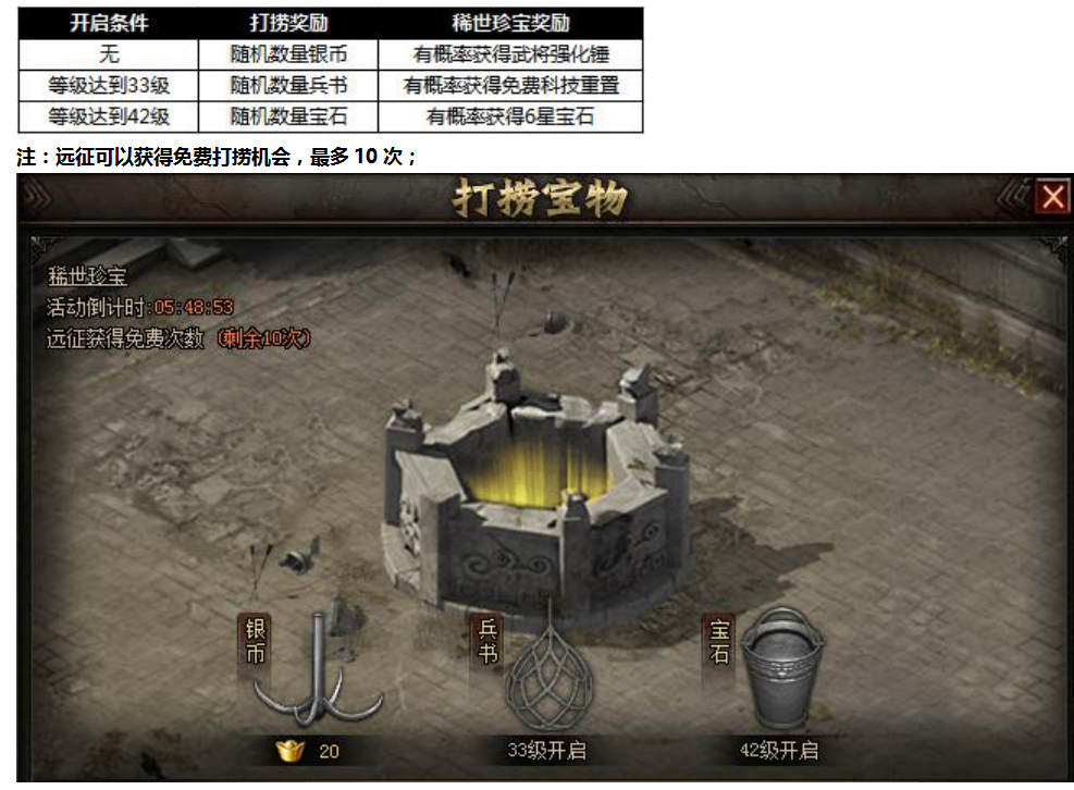 活动内容:活动期间,玩家可使用不同打捞工具在井中打捞宝物。每次打捞必定获得银币、兵书或宝石奖励,同时也有概率获得稀世珍宝!(6月21日之后打捞宝物银币类奖励大幅提升,不可错过哦~)