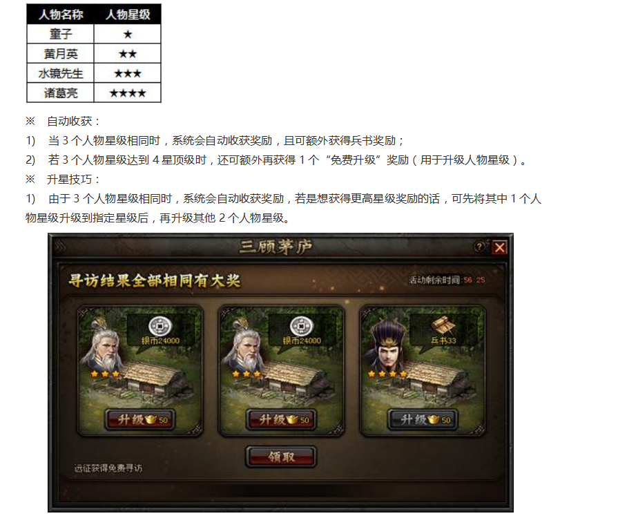1) 每次寻访后会出现3个不同星级的人物,花费金币可升级星级,点击“领取”后将收获奖励。