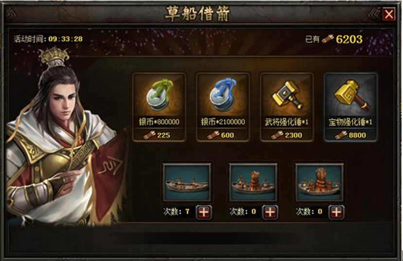 活动内容:活动期间,玩家可通过招募船队出航收集箭矢。筹集的箭矢不仅可用来兑换银币,更可兑换武将强化锤及宝物强化锤!快去收集箭矢吧!