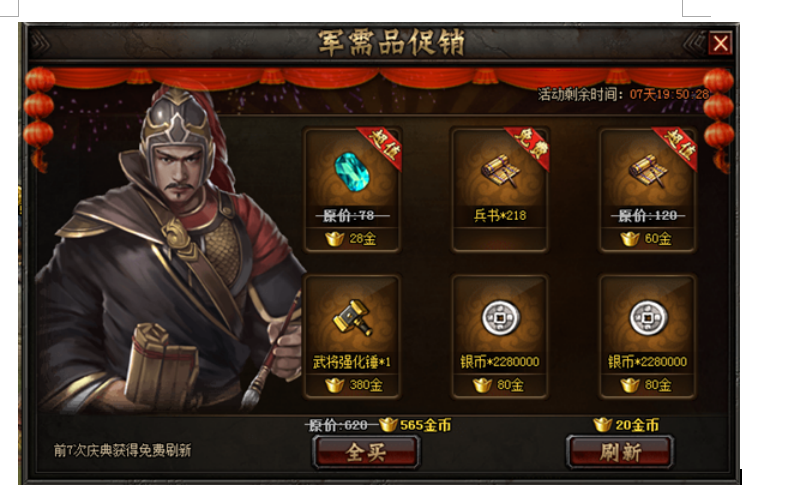 3、每次刷新出来的物品如果选择全部购买还将获得折上折,福利拿不停,住各位将军元旦愉快!