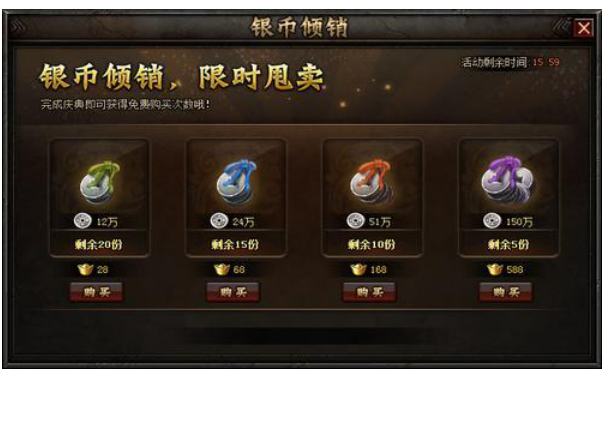 活动内容:活动期间,玩家可花费金币购买不同档次的银币礼包,等级越高每档银币越多;同时玩家每次完成庆典或国君犒赏可获得1次第一档免费银币购买次数。