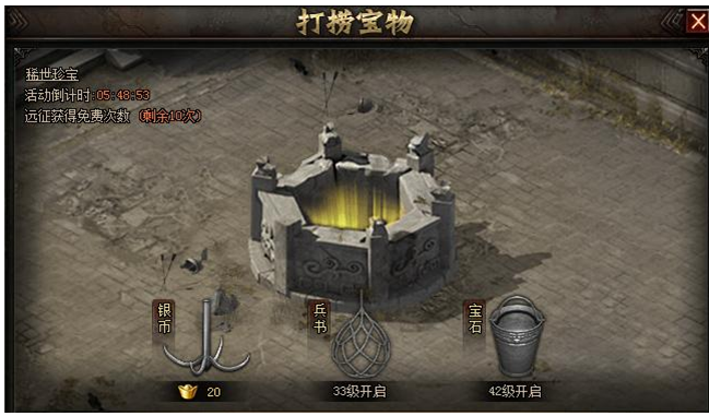 活动内容:活动期间,玩家可使用不同打捞工具在井中打捞宝物。每次打捞必定获得银币、兵书或宝石奖励,同时也有概率获得稀世珍宝!(6月21日之后打捞宝物银币类奖励大幅提升,不可错过哦~)