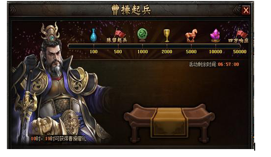 活动内容:活动期间,通过充值资助曹操可获得曹操回赠的赠礼!同时玩家在10点或19点可获领取免费曹操赠礼,宝箱内可开出10金币。