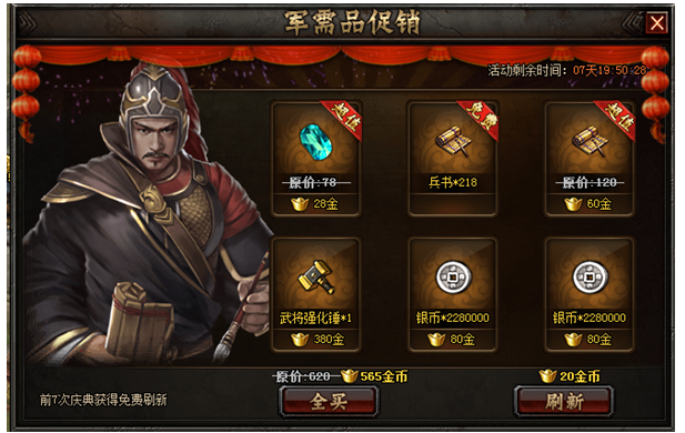 3、每次刷新出来的物品如果选择全部购买还将获得折上折,福利拿不停,住各位将军周末愉快!