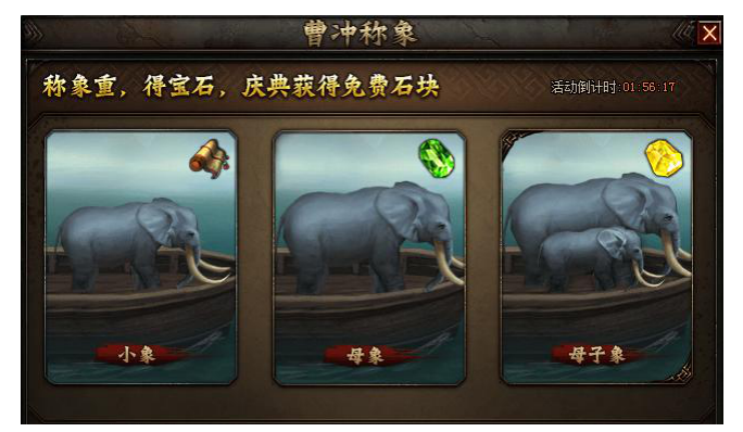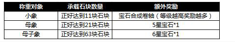 活动内容:活动期间,玩家通过给小象、母象或母子象称重来获得宝石或宝石合成卷轴奖励,且增加石块达到指定数量还可获得曹操赐予的额外奖励。