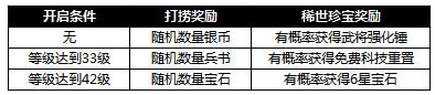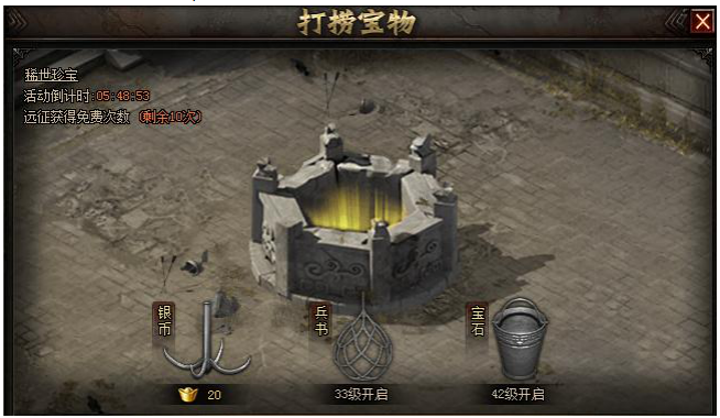 活动内容:活动期间,玩家可使用不同打捞工具在井中打捞宝物。每次打捞必定获得银币、兵书或宝石奖励,同时也有概率获得稀世珍宝!(6月21日之后打捞宝物银币类奖励大幅提升,不可错过哦~)