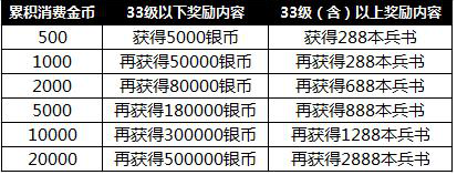 注:消费所赠送的银币或兵书,可累积领取(例:32级玩家累计消费满5000金币,共可获得360000银币)