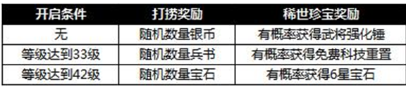 限时1天打捞宝物大放送,活动期间,大家可以通过捞宝物获得大量的银币、兵书或宝石奖励,同时还有机会获得稀世珍宝(武将强化锤、免费科技重置次数或6星宝石)奖励!