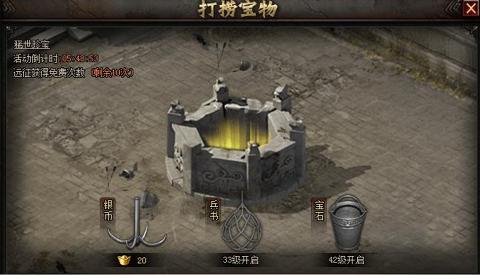 活动内容:活动期间,玩家可使用不同打捞工具在井中打捞宝物。每次打捞必定获得银币、兵书或宝石奖励,同时也有概率获得稀世珍宝!(6月21日之后打捞宝物银币类奖励大幅提升,不可错过哦~)
