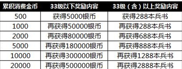 注:消费所赠送的银币或兵书,可累积领取(例:32级玩家累计消费满5000金币,共可获得360000银币)
