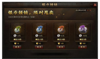 活动内容:活动期间,玩家可花费金币购买不同档次的银币礼包,等级越高每档银币越多;同时玩家每次完成庆典或国君犒赏可获得1次第一档免费银币购买次数。