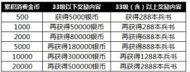 注:消费所赠送的银币或兵书,可累积领取(例:32级玩家累计消费满5000金币,共可获得360000银币)