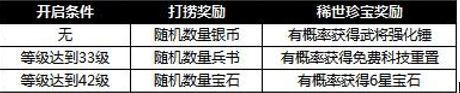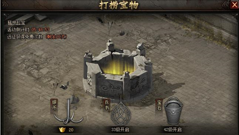 活动内容:活动期间,玩家可使用不同打捞工具在井中打捞宝物。每次打捞必定获得银币、兵书或宝石奖励,同时也有概率获得稀世珍宝!(6月21日之后打捞宝物银币类奖励大幅提升,不可错过哦~)