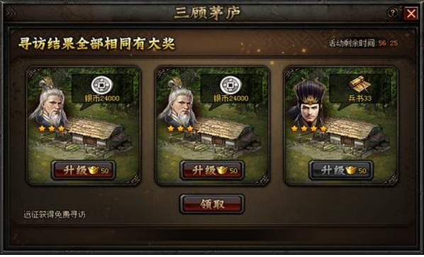 活动内容:活动期间,玩家通过寻访可获取银币、粮食、兵书等奖励,每次远征后可获得免费寻访次数(最多7次),更可花费金币进行寻访。