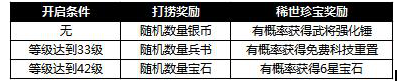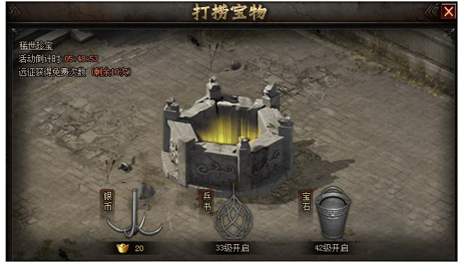 活动内容:活动期间,玩家可使用不同打捞工具在井中打捞宝物。每次打捞必定获得银币、兵书或宝石奖励,同时也有概率获得稀世珍宝!(6月21日之后打捞宝物银币类奖励大幅提升,不可错过哦~)