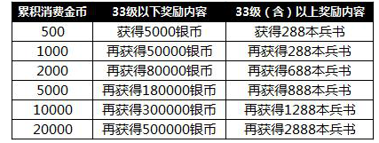 注:消费所赠送的银币或兵书,可累积领取(例:32级玩家累计消费满5000金币,共可获得360000银币)