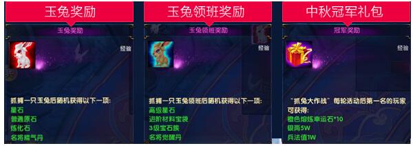 活动内容:中秋活动期间,玩家每小时即可参加抓兔大作战活动,玩家将进入活动场景化身为吴刚,抓捕可爱的小玉兔~白白胖胖的玉兔怀揣着各种珍稀道具,各位玩家还不快快行动将它们收入囊中?当然,玉兔急了也是会咬人的~每抓捕一只玉兔玩家将会增长5点怒气,一旦达到100点怒气值,可就要被提出活动了呦o(╥﹏╥)o玩家可以使用元宝或绑元削弱怒气,游戏场景内还有雪宫萝卜亦能降低玩家的怒气,帮助玩家抓住更多的兔子~O(∩_∩)O~抓捕兔子数量最多的玩家,还会获得额外奖励呦~快来抓兔子吧!