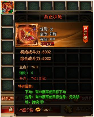 还记得开服基金时的珍贵双极品开光戒指么?像他这么极品的还有一个!本期双11特惠推出双极品开光戒指!下马属性4%、定身属性5%,装备更有两倍开光效果,错过今年双11,这件装备只能等明年啦!