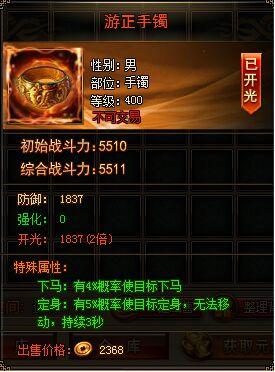 还记得开服基金时的珍贵双极品开光戒指么?还记得双11特惠推出的双极品开光项链嘛!像他这么极品的还有一个!本期特惠推出双极品开光手镯!下马属性4%、定身属性5%,装备更有两倍开光效果,错过活动,这件装备只能用500金叶子兑换!