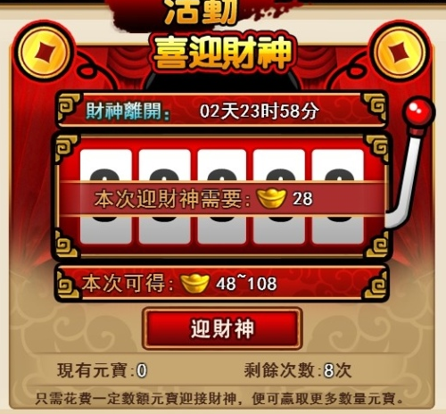 活动期间,玩家固定消耗一定数量的不绑定元宝(288元宝、888元宝、2888元宝、8888元宝)、将可以在幸运财神拉霸活动中拉出比投入元宝数更多的幸运奖励!玩家必须从小到大依次完成拉霸游戏!每个玩家最多只能使用一次相对应的元宝迎接财神哦
