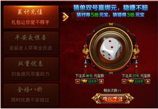 活动期间,玩家可在全民竞猜的活动中,花费少量元宝,百分百获得3倍或者5倍的元宝返还,绝对的福利,绝对的稳赚不赔!每个玩家只能参与5次的全民竞猜活动哦!快速获得绑定元宝的机会就在于此,请一定不要错过哦!