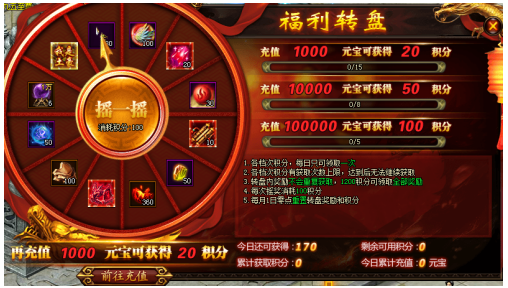 1. 玩家每天累计充值达到条件,可获得转盘积分,