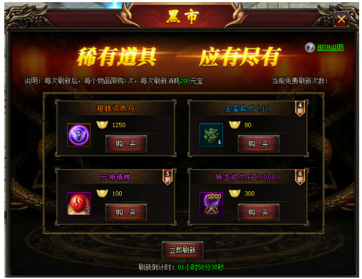 黑市可通过刷新购买到非常稀有的道具